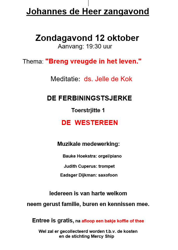 Collecte bij de uitgang: t.b.v. onkosten en stichting Mercy Ships. Nederland.